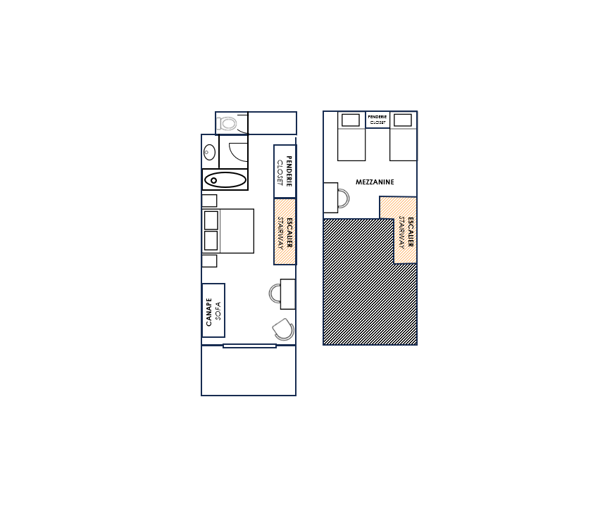 La Mezzanine est équipée d’un lit double de 160 x 200 cm ou de deux lits twin de 80 x 200 cm et de deux lits de 90 x 200 cm sur la mezzanine de 13  m², d’un coin salon et d’une table basse (le canapé du salon se transforme en un vrai lit de 90 x 190 cm pouvant accueillir une cinquième personne). Sa salle de bains est pourvue d’une baignoire. WC séparés.