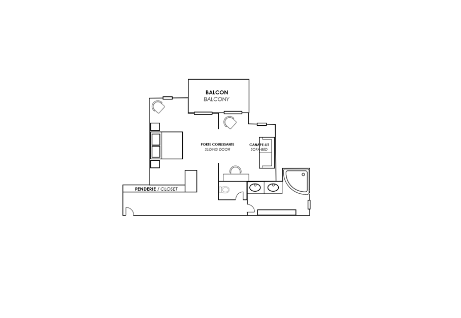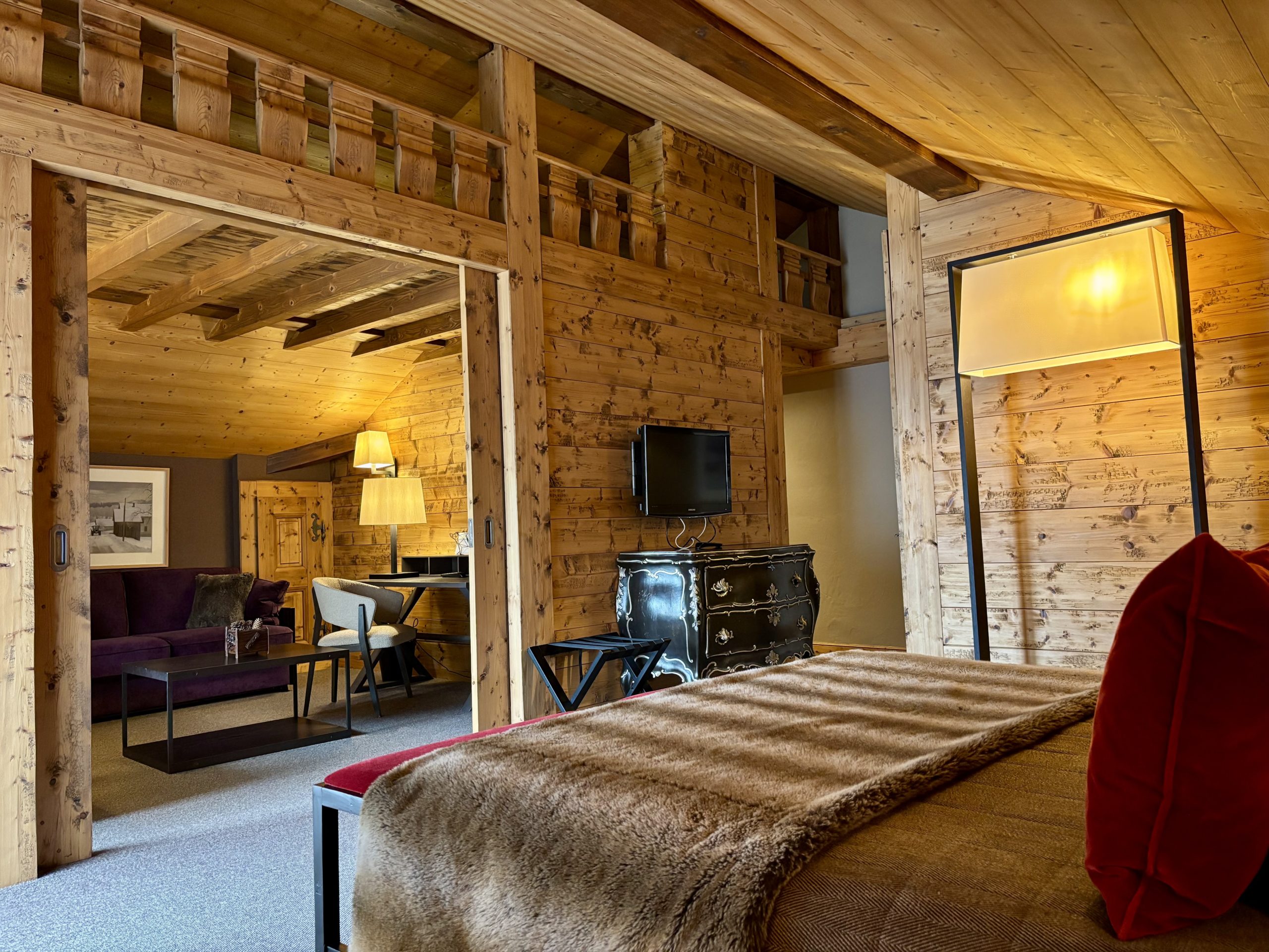 Cette magnifique suite de 60 m² est nichée au dernier étage de l’hôtel avec une vue superbe sur la montagne. Elle bénéficie d’une orientation au Sud. Les portes coulissantes de la chambre ouvrent sur un beau salon et quoi de mieux pour la détente qu’une salle de bain majestueuse à l’esprit zen!